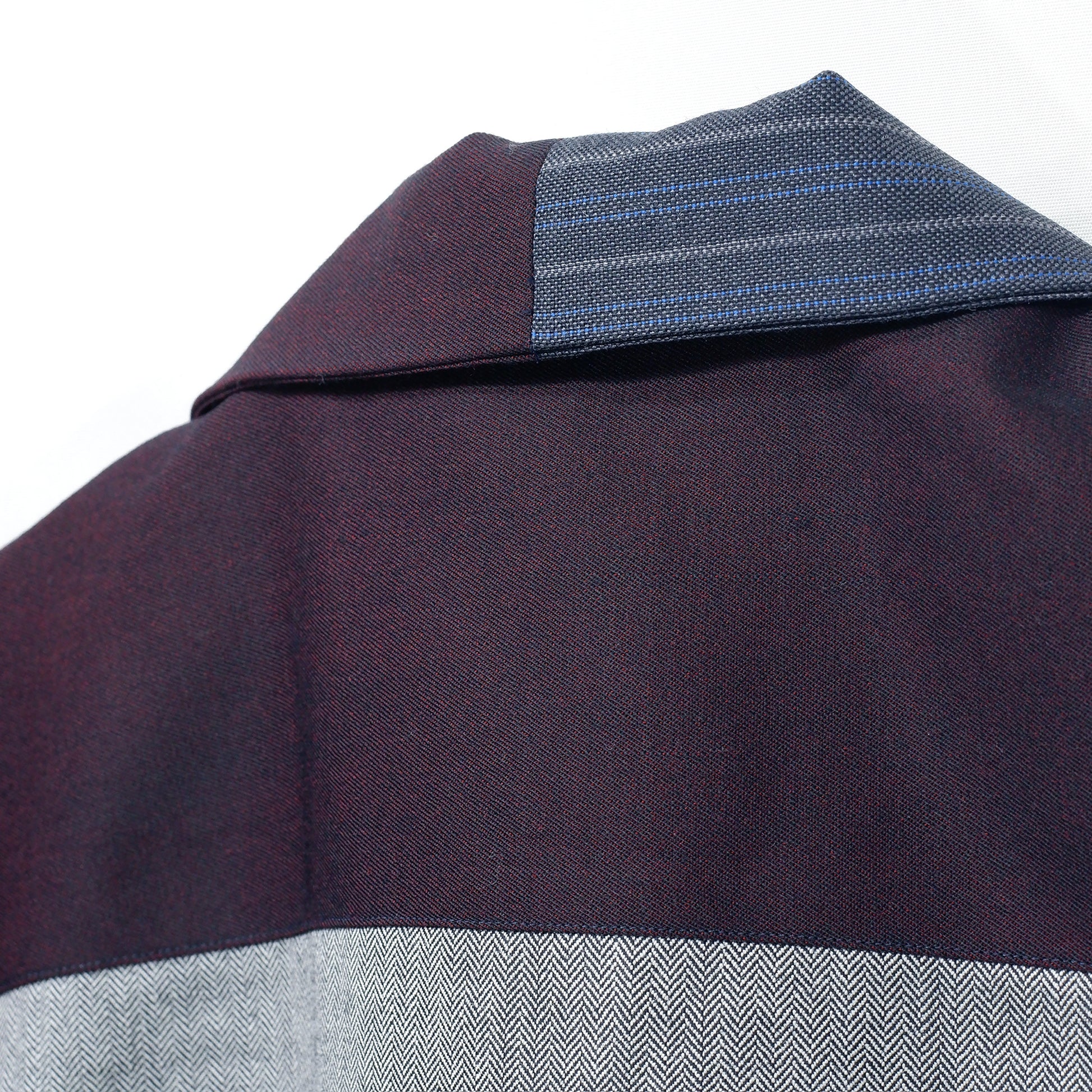 使用している生地は、ヴィンテージファブリックや、高級スーツ地として扱われてきた希少素材のみです。カッティングの際にわずかに残された上質な生地まで丁寧に収集し、一着ごとにクレイジーパターンとして再構成しております。