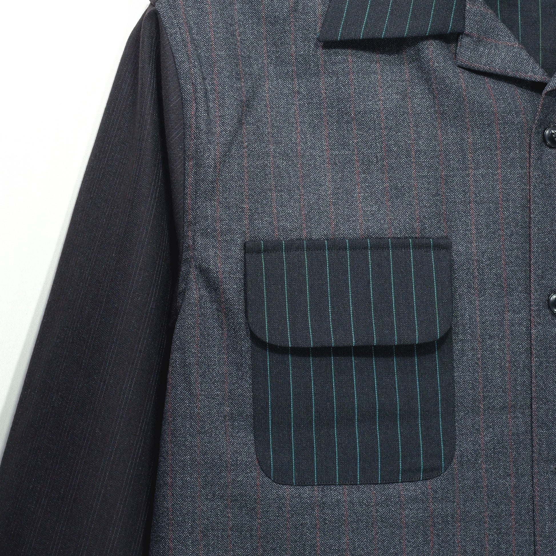 使用している生地は、ヴィンテージファブリックや、高級スーツ地として扱われてきた希少素材のみです。カッティングの際にわずかに残された上質な生地まで丁寧に収集し、一着ごとにクレイジーパターンとして再構成しております。